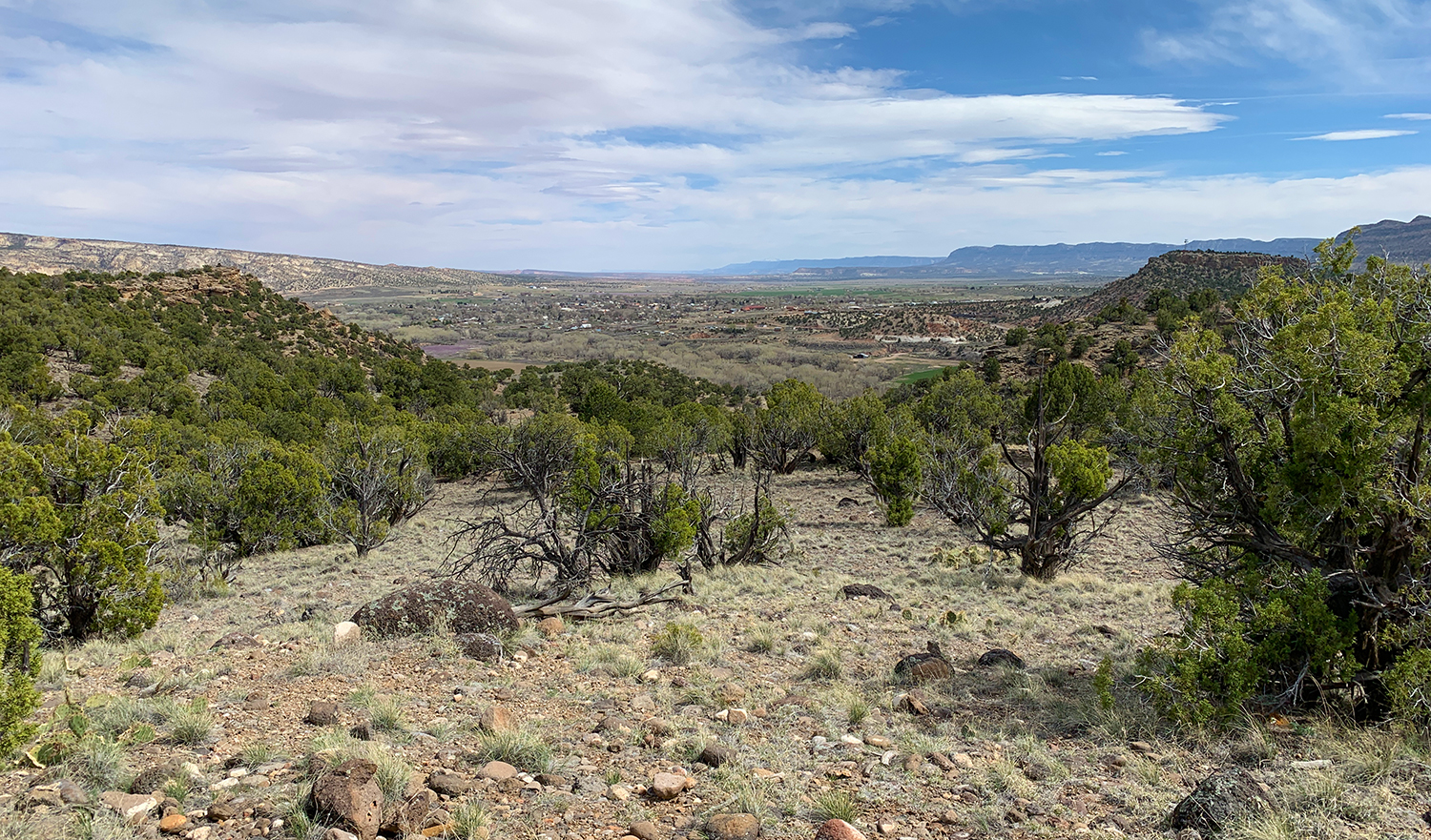 The Petrified Forest Trail is a moderately strenuous, 1.0 mile lollipop loop that winds up the side of a steep mesa 250 feet to a plateau and pygmy forest of piñon pine and juniper trees.